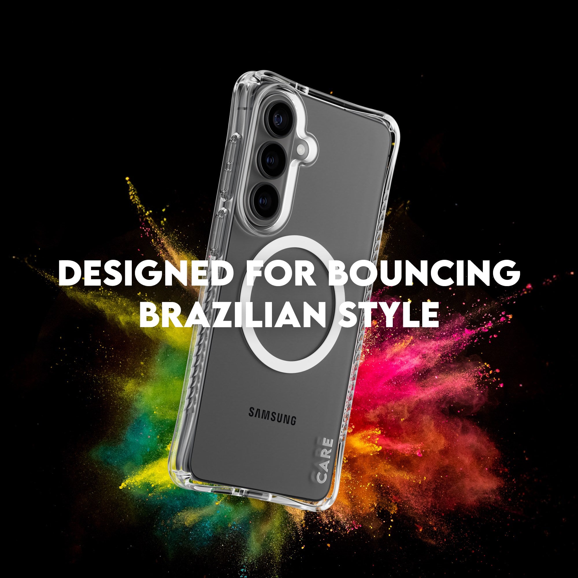 Protect Your Tech in Style Elevate your phone’s look while keeping it protected with the Fashionable SAMBA Case from CARE by PanzerGlass®. Designed to be both stylish and sustainable, this case is made from 100% recycled TPU and features enhanced corner protection to protect against everyday bumps and drops. The smooth grip ensures unmatched comfort, making it as functional as it is fashionable. Seamlessly Qi compatible, this case ensures your device stays charged and ready, without compromising on style. Whether you’re accessorizing for the day or powering up on the go, this case has you covered with flawless connectivity to all your Qi accessories. DARE TO CARE CARE is a playful and protective international tech and lifestyle brand featuring a range of products created using the highest quality materials and influenced by fashion, art, and music. We care about people and the world we live in. We care about sustainability and self-expression. And we care about tech and extending its lifetime. So protect your tech in style and show the world you CARE.