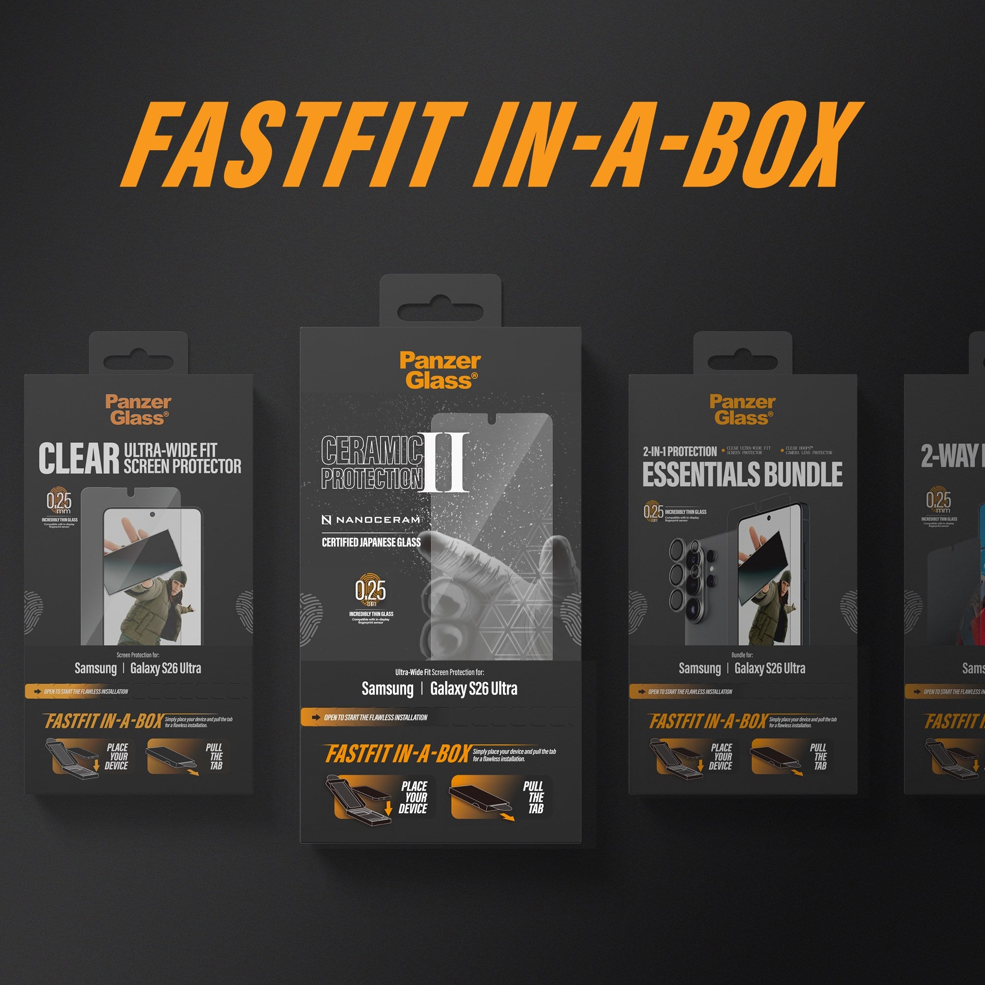FLAWLESS INSTALLATION EVERY TIME. Installation has never been easier with the new FASTFIT IN-A-BOX system. Say goodbye to alignment issues and dust intrusion. Simply place your phone face-up, pull the tab, and enjoy a flawless installation every time.